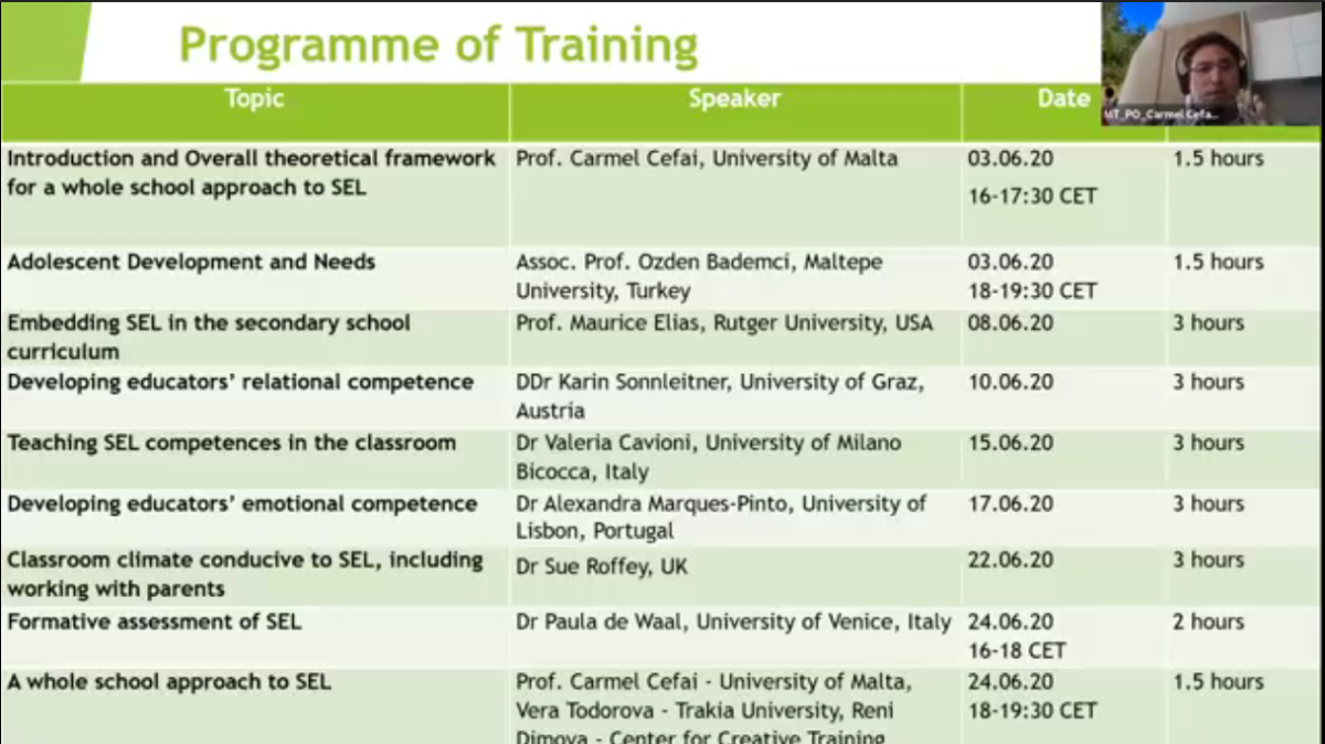 Програмата включва 7 срещи, всяка от които е с продължителност от 3 часа (онлайн) водени от гост-лекторите от Университетът в Малта, Малтепе Университет, Турция, Рутгер Университет, САЩ, Университет в Грац, Автрия, Университет в Милано, Италия, Университет в Лисабон, Португалия и Университет във Венеция, Италия. Програмата включва и обучения водени от представители на Тракийски университет, ДИПКУ и Център за творческо обучение, София.
