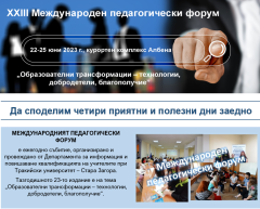 Екипът на ДИПКУ - Стара Загора има удоволствието да Ви покани на XXIII Международен педагогически форум на тема „Образователни трансформации – технологии, добродетели, благополучие”. Събитието ще се проведе на 22 - 25 юни 2023 г. в курортен комплекс ...