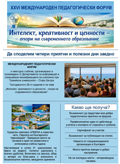 Екипът на ДИПКУ - Стара Загора има удоволствието да Ви покани на XXVI Международен педагогически форум на тема „Поглед в бъдещето – устойчиви практики и перспективи в образованието”.